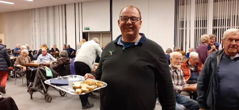 Na al dit lekkers vertrokken de bussen naar Arnhem, waar om 20.00 uur ingescheept werd. We werden gelijk verrast met vele soorten taarten bij de koffie.